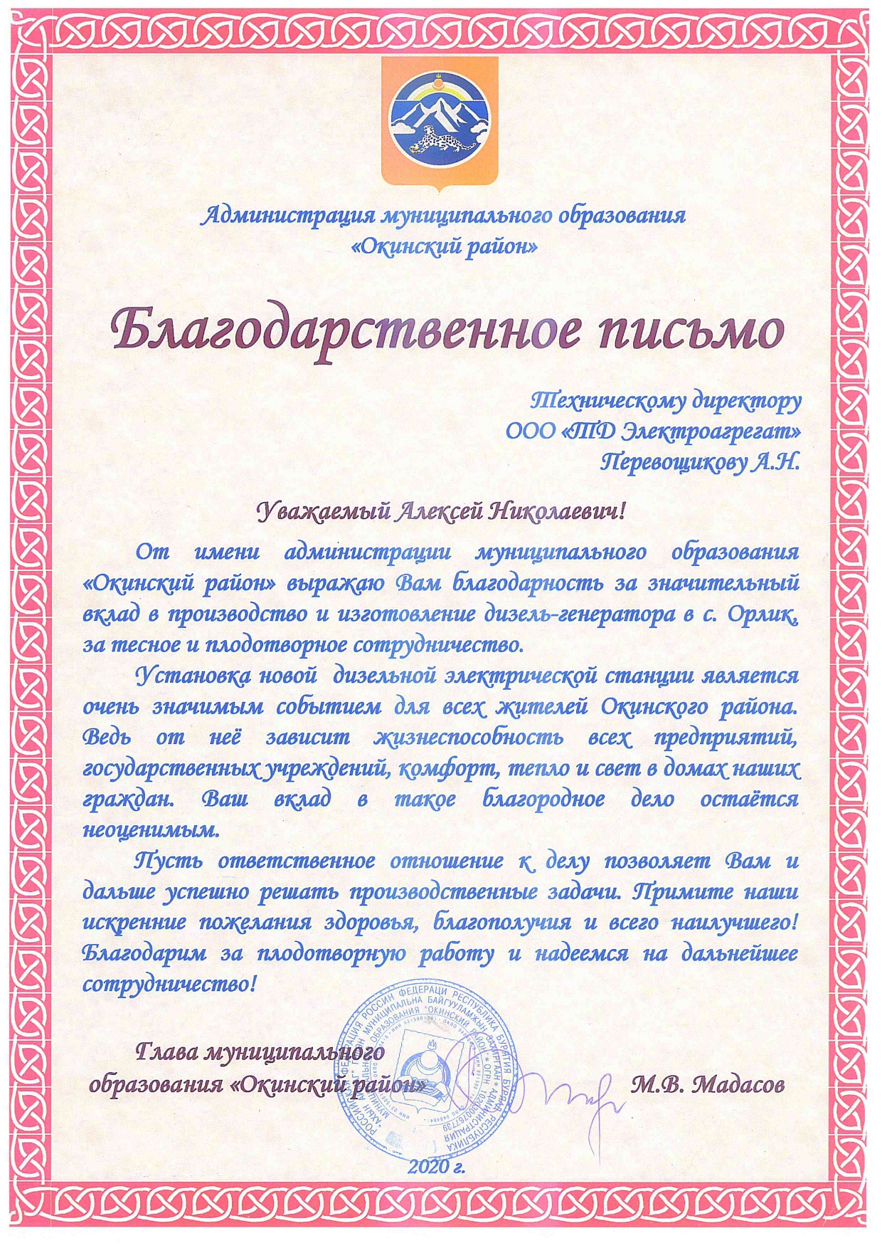 От имени администрации муниципального образования "Окинский район" выражаю Вам благодарность за значительный вклад в производство и изготовление дизель-генератора в с. Орлик, за тесное и плодотворное сотрудничество.