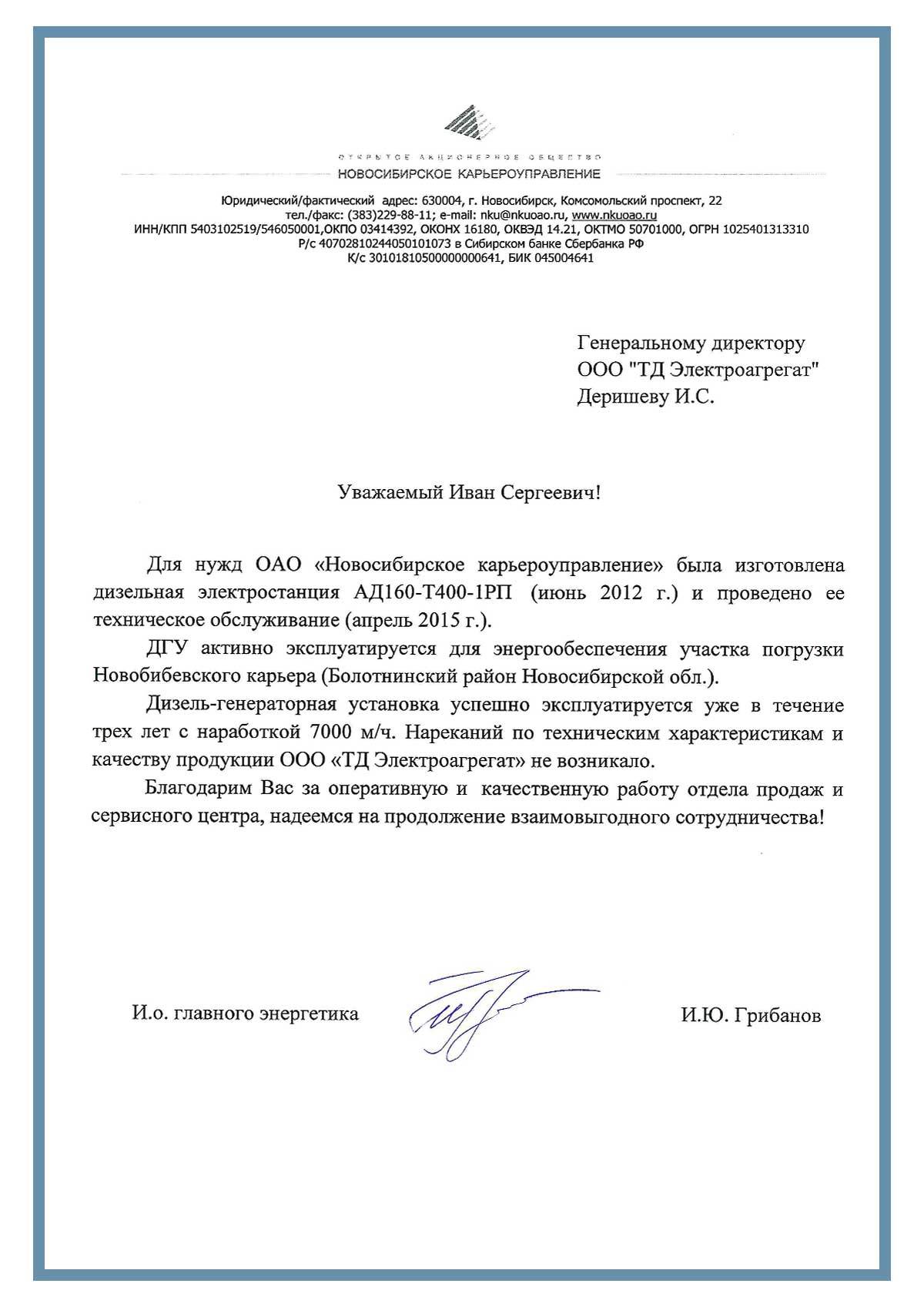 Отзыв контрагентов о компании ООО «ТД Электроагрегат» и  исполненном проекте для ОАО "Новосибирское карьероуправление" г. Новосибирск