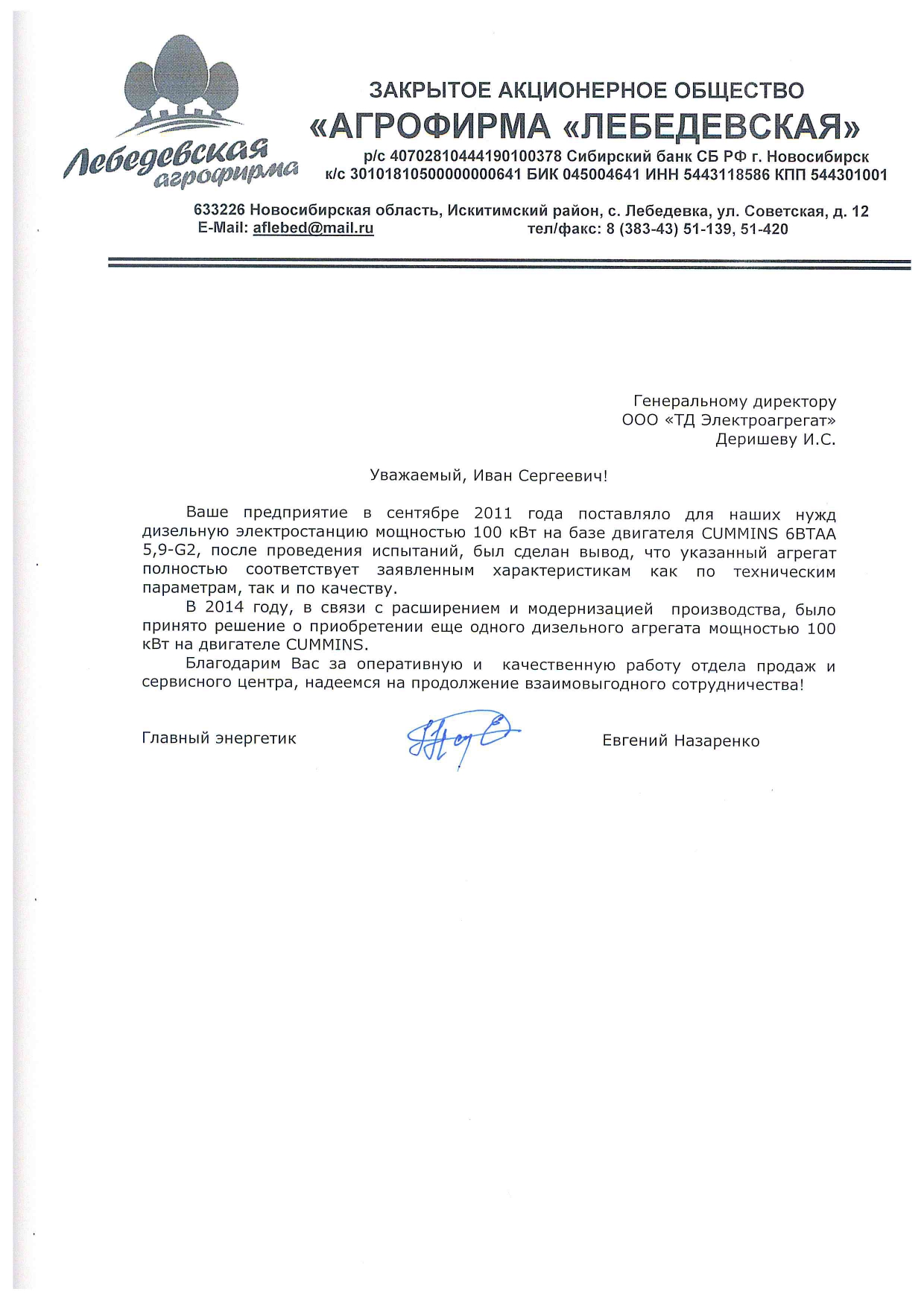 [BROWSER_TITLE] => Отзыв о выполненной поставке ДГУ компанией ООО «Торговый Дом Электроагрегат» г. Новосибирск для ЗАО "Агрофирма "Лебедевская", Новосибирская обл.